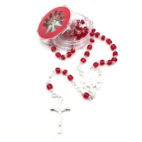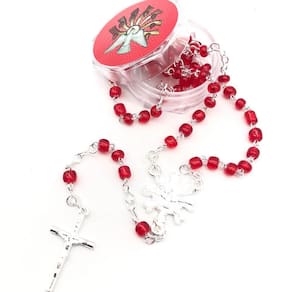 Terço Crisma em miçangaContas em miçanga vermelha(milímetro variável) |Metais em prateado |Aprox. 30,5 cm de comprimentoEmbalagem: Caixa acrílica comimagem na tampa
