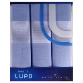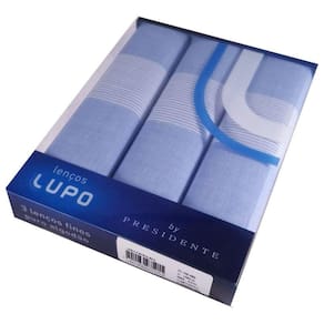 Caixa contendo 3 Lenços Finos masculinos Lupo by Presidente medindo 41 x 41 centímetros e fabricados em teares de última geração com fio puro 100% algodão penteado e mercerizado. Possuem cores firmes, toque macio e grande poder de absorção. Graças a esses cuidados, é um produto único, de qualidade e durabilidade insuperáveis. Ideal para usar no seu dia-a-dia e colocar no seu paletó ou blazer.