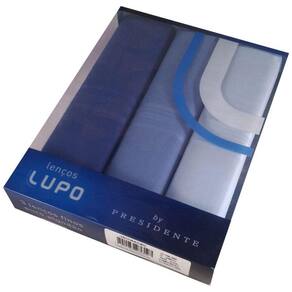 Caixa contendo 3 Lenços Finos masculinos Lupo by Presidente medindo 41 x 41 centímetros e fabricados em teares de última geração com fio puro 100% algodão penteado e mercerizado. Possuem cores firmes, toque macio e grande poder de absorção. Graças a esses cuidados, é um produto único, de qualidade e durabilidade insuperáveis. Ideal para usar no seu dia-a-dia e colocar no seu paletó ou blazer.