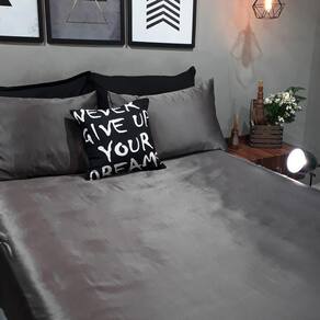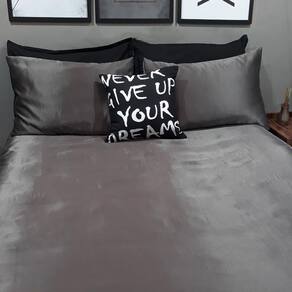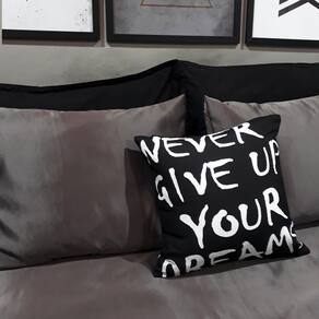 Kit composto por 4 peças. 1 lençol com elástico para cama de 1,88cmx1,38cm para colchões de até 40cm de altura - lençol em cetim cor grafite 2 capas de travesseiros fronhas de 0,70cmx0,50cm - capas em cetim cor grafite 1 almofada exclusiva da grife de 45cm x 45cm com enchimento - preto com estampa em branco - estampa: never give up your dreams - nunca desista dos seu sonhos - almofada com enchimento.