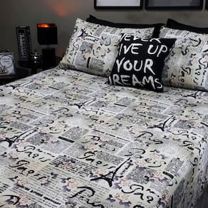 Kit composto por 4 peças. 1 lençol com elástico para cama de 1,88cmx1,38cm para colchões de até 40cm de altura - lençol estampa Paris Designer 2 capas de travesseiros fronhas de 0,70cmx0,50cm - capas estampa Paris Designer 1 almofada exclusiva da grife de 45cm x 45cm com enchimento - preto com estampa em branco - estampa: never give up your dreams - nunca desista dos seu sonhos - almofada com enchimento.