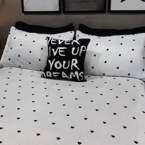 Kit composto por 4 peças. 1 lençol com elástico para cama de 2,03cmx0,96cm para colchões de até 40cm de altura - lençol cor branco com estampa love black 2 capas de travesseiros ( fronhas ) de 0,70cmx0,50cm - capas em cor branco com estampa love black 1 almofada exclusiva da grife de 45cm x 45cm com enchimento - preto com estampa em branco - estampa: never give up your dreams - nunca desista dos seu sonhos - almofada com enchimento.