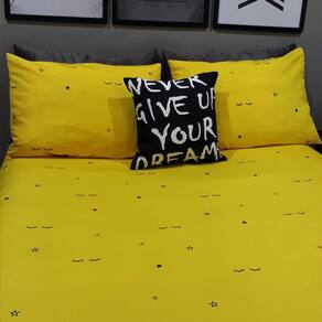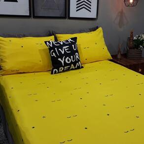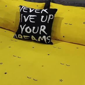Kit composto por 4 peças. 1 lençol com elástico para cama de 2,03cmx0,96cm para colchões de até 40cm de altura - lençol cor amarelo sol com estampa Sonhos Designer 2 capas de travesseiros fronhas de 0,70cmx0,50cm - capas em cor amarelo sol com estampa Sonhos Designer 1 almofada exclusiva da grife de 45cm x 45cm com enchimento - preto com estampa em branco - estampa: never give up your dreams - nunca desista dos seu sonhos - almofada com enchimento.