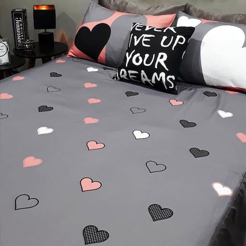 Kit composto por 2 peças. 1 lençol com elástico para cama de 1,88cmx0,88cm para colchões de até 40cm de altura - lençol cor cinza com estampa Love Designer 1 capa de travesseiro fronha de 0,70cmx0,50cm - capas em cor cinza com estampa Love Designer
