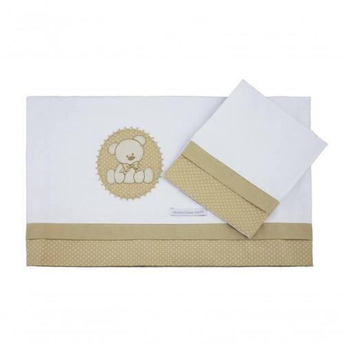 01 lençol de cima branco com vira bordada e barrado com tecido estampado 56cm x 100cm