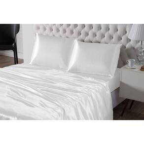 Lençol De Seda 4 Peças Casal King Branco Cetim Jogo de cama cetim charmousse king 4 peças Contém: 01 lençol de cima 2,85m x 2,60m 01 lençol de baixo com elástico 2,95m x 2,85mPara colchão de 1,93m x 2,03m x 40cm 02 fronhas 70cm x 50cm Composição: 100% pliésterTecido: cetim charmousse