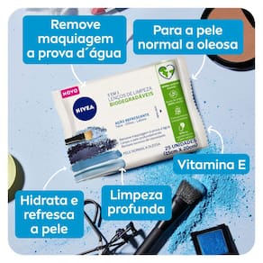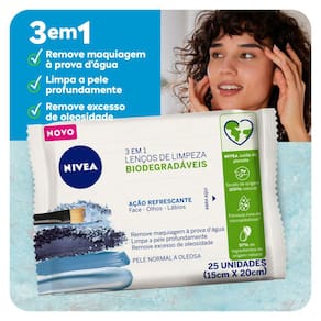 Os Lenços De Limpeza 3x1 Nivea Visage são utilizados para remover maquiagem ou retirar todas as impurezas e oleosidades da pele, deixando-a macia e hidratada. Possui um delicado aroma que deixa a pele suavemente perfumada e com a sensação de frescor e bem estar diariamente. Pode ser usado em todos os tipos de pele.