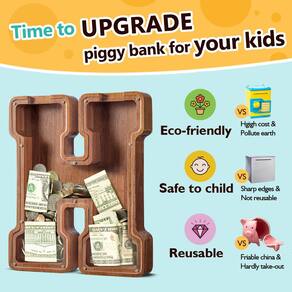 Tem problemas para pegar um presente para seus filhos ou netos? Aqui está ela! Nosso cofrinho grande e extra grande em forma de carta, feito de madeira 100% orgânica. É o presente perfeito para bebês/crianças/ou qualquer pessoa com seus nomes em inglês! O vidro acrílico na parte superior permite ver através da caixa de moedas e avaliar o progresso da economia de dinheiro. Há um compartimento para moedas na parte superior, onde as moedas devem ser jogadas. E o compartimento é amplo o suficiente para qualquer moeda e notas. Você também pode ter seu nome completo gravado a laser no acrílico, o que o tornará único para você ou para a pessoa que você ama. Como tirar o dinheiro? Você pode abrir a caixa de dinheiro desparafusando vários parafusos pequenos e remover o vidro acrílico. - Design recortado, muito maior: o design do modelo de edição 2.0 mais recente do PIGGY Bank com base no anterior, o que faz com que pareça mais com letras. Formas de letras muito mais fofas com designs ampliados, maior capacidade mais espessa, bonito, alto volume e mais suave do que outras no mercado! - Brinquedos educativos, presente perfeito: este cofrinho de madeira será um presente perfeito para bebês recém-nascidos, crianças, meninas, meninos e todas as crianças. . O design inicial personalizado das letras mais o nome personalizado gravado a laser na capa de acrílico pode observar quanto dinheiro eles economizaram para promover uma sensação de economia desde tenra idade. Além disso, eles sentirão como foram tratados, o que ajudará a tornar o relacionamento mais próximo. - Material e design atualizados: a edição de atualização 2.0 melhorou o processo de produção e artesanato, além disso, nosso cofrinho de madeira de nogueira de alta qualidade torna nosso cofrinho de moedas natural, seguro e inquebrável. Além disso, eles podem funcionar como decoração de madeira. - Seguro e prático: o banco de letras A-Z é feito de 100% madeira, natural e durável, o serviço de nome personalizado o torna único como presente quando o bebê recém-nascido e feriados como aniversário, volta às aulas, ação de graças, natal e ano novo. Ótimo presente de inauguração de casa para adultos como enfeites decorativos. Embalado com LOVE HOME Sweet Home. - SERVIÇO DE NOME GRAVADO A LASER: Agora oferecemos suporte à gravação a laser de nomes e gravaremos o texto que você precisa no acrílico da sua carta cofrinho, qualquer problema gratuitamente, responderemos dentro de 48 horas.