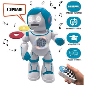 Apresentamos o LEXiBOOK Powerman Kid, um emocionante robô bilingue que fala inglês e espanhol, ideal para crianças! Interativo e expressivo, ele dança, conta piadas, toca música e muito mais! Com mais de 450 quizzes educativos sobre gramática, números, animais e locais, este robô estimula a aprendizagem de forma divertida. Com o Story Maker, as crianças podem criar até 10.000 histórias engraçadas e loucas, e ainda desfrutar de 8 fábulas de Esopo como histórias para dormir. Programável, o Powerman Kid ajuda as crianças a descobrirem a lógica da programação, permitindo adicionar música e salvar coreografias. Com várias faixas musicais, ele dança pela sala como nenhum outro robô. Possui função karaokê, repetindo e memorizando o que é dito, além de cantar em modo karaokê. E mais, ele dispara discos de espuma coloridos de forma segura. Controle-o com o joystick, movendo-se para frente, para trás, para a direita e para a esquerda, garantindo diversão em todas as direções!