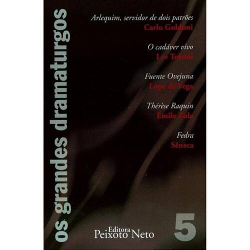 Embalagem de luxo contendo cinco livros da coleção Os grandes dramaturgos. Volumes 23 a 27. vol. 23: Arlequim, servidor de dois patrões, de Carlo Goldoni. vol. 24: O cadáver vivo, de Lev Tolstói. vol. 25: Fuente Ovejuna, de Lope de Vega. vol. 26: Thérèse Raquin, de Émile Zola. vol. 27: Fedra, de Sêneca.