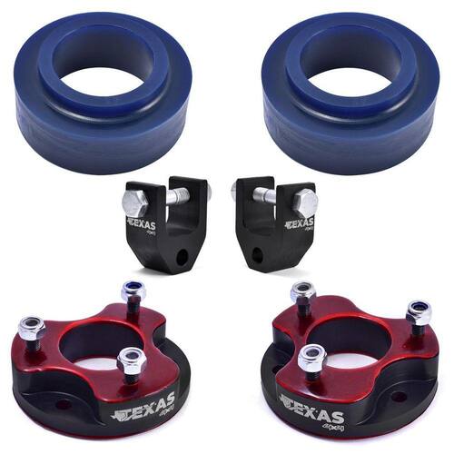 Especificações: Kit lift de 2 polegadas para subir 5 cm de altura na dianteira e traseira. Calços traseiros fabricados em pu poliuretano . Calços dianteiros e prologadores fabricados em alumínio anodizado. Pintura preta fosca. Não precisa de adaptações.