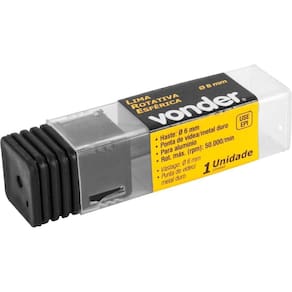 Marca: Vonder PlusConteúdo da embalagem: 1 Lima rotativa.Destaques e diferenciais:Ponta de vídea/metal duro, proporcionando maior vida útil, com geometria e ranhura apropriada para desbastes em peças de alumínio, com alto poder de remoção proporcionandondo agilidade e melhor acabamento no produto.Dicas de uso:Utilizada em retificadeira indicada para desbaste e acabamento em alumínio.Detalhes Técnicos:Formato da lima: Esférica Diâmetro: 8,0 mm Comprimento útil: 7,0 mm Diâmetro da haste: 6,0 mm Comprimento total: 48,0 mm Rotação máxima: 22.000/min