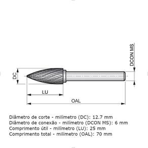 Lima tipo árvore pontiaguda (formato G), diâmetro 12.7mm com 25mm comprimento de corte, 70mm comprimento total e 6mm haste, haste de aço temperado com ponta soldada de metal duro e acabamento brilhante, canal duplo corte com espaçamento fechado das arestas (DC) para contorno multi-angular e corte de cantos estreitos em áreas com difícil acesso em aço e aço fundido, aço inoxidável, ferro fundido, cobre ou ligas de cobre, superligas termo-resistentes e materiais endurecidos Brilhante (sem revestimento). Material Duro (Metal Duro). Forma de Árvore Pontiaguda. Geometria Corte Duplo. Peso bruto: 45g Diâmetro de corte: 12.70 mm Diâmetro de conexão: 6 mm Comprimento útil: 25 mm Comprimento total: 70 mm Modelo: P81312.7X6.0 Marca: Dormer