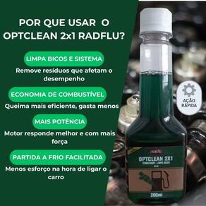 O Optclean 2x1 Radflu 200ml é um aditivo para combustível com dupla ação: limpa bicos injetores e atua como otimizador de desempenho, ideal para veículos movidos a gasolina, etanol ou flex. Sua fórmula avançada remove impurezas do sistema de alimentação, elimina a umidade do combustível e promove uma combustão mais eficiente, resultando em melhor desempenho do motor e economia de combustível.