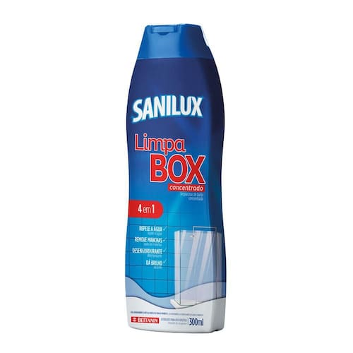 Limpa Box 300Ml Sanilux Bettanin Cuidado do Banheiro por completo. O Limpa Box Sanilux é um produto 4 em 1: Remove Manchas, Desengordurante, dá brilho e repele a água. Sua fórmula exclusiva mantém o box limpo dos vidros aos azulejos. O Limpa Box Sanilux vem com 300ml. Sanilux, mais brilho na limpeza. Ean: 7896001058200