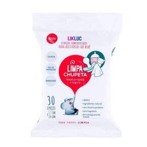 Limpa Chupeta Lenços Higienizadores - Likluc A chupeta ou mamadeira caiu no chão Os lenços umedecidos limpa chupetas oferecem segurança e praticidade na higienização de chupetas, mordedores, bicos de mamadeira, copos e até mamilos de lactantes. Sem álcool ou fragrâncias, feitos à base de água e ingredientes seguros, o limpa chupeta LikLuc usa o poder natural do bicarbonato de sódio, para uma limpeza rápida e prática dos acessórios do bebê. Fácil de levar na bolsa, perfeito para uso na rua ou viagens. Caratérsticas Contém 30 lenços descartáveis atóxico ingredientes naturais dermatologicamente testado Ean: 07898655870207