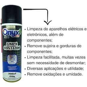 Descrição Completa: O Limpa Contato Onyx 300ml é um produto de alta performance desenvolvido para limpar e proteger componentes eletrônicos e elétricos. Ideal para eliminar sujeiras, resíduos de óleo, poeira e outros contaminantes que podem comprometer o desempenho e a eficiência dos contatos elétricos. Sua fórmula não condutiva e de secagem rápida garante uma limpeza segura sem deixar resíduos, prevenindo falhas e mau funcionamento dos equipamentos. Características: Volume: 300mlFórmula não condutivaSecagem rápidaNão deixa resíduosRemove sujeiras, óleos e poeiraAplicações: Placas de circuito impressoConectoresRelésChaves elétricasEquipamentos de áudio e vídeoOutros componentes eletrônicos e elétricos Marca: Não Informado
