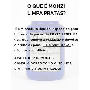 Limpa Prata 925 Monzi 125Ml Liquido Limpeza Jóia Corrente Anel Restaura Brilho Grande Descrição do produto: O limpa prata monzi é um produto específico para limpar joias de prata e fácil de usar. Atenção para o modo de usar Modo de usar: - passe o limpa pratas monzi no objeto de prata ou cobre utilizando algodão. - enxágue em água corrente e enxugue bem com uma flanela mágica. Descarte o algodão. - para objetos maiores, utilize um recipiente de vidro ou plástico com imersão da peça por 10 segundos apenas. - lave bem o recipiente utilizado. - descarte o produto em água corrente. - não risca e nem desgasta a prataria. - limpa pratas monzi retira a oxidação e a gordura, deixando ainda, uma camada de proteção no objeto. Marca: Não Informado Ean: 7732647216669