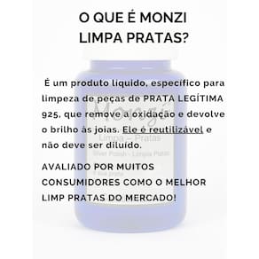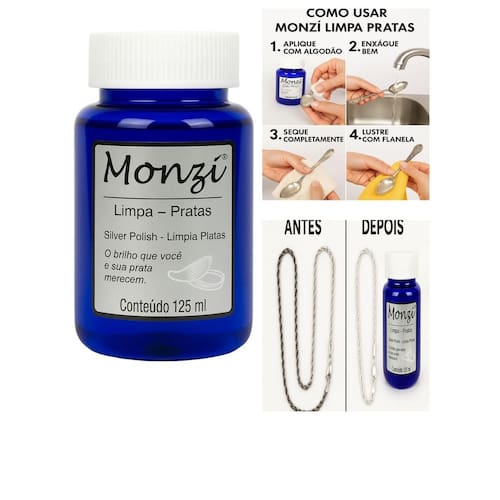 Limpa Prata 925 Monzi 125Ml Liquido Limpeza Jóia Corrente Anel Restaura Brilho Grande Descrição do produto: O limpa prata monzi é um produto específico para limpar joias de prata e fácil de usar. Atenção para o modo de usar Modo de usar: - passe o limpa pratas monzi no objeto de prata ou cobre utilizando algodão. - enxágue em água corrente e enxugue bem com uma flanela mágica. Descarte o algodão. - para objetos maiores, utilize um recipiente de vidro ou plástico com imersão da peça por 10 segundos apenas. - lave bem o recipiente utilizado. - descarte o produto em água corrente. - não risca e nem desgasta a prataria. - limpa pratas monzi retira a oxidação e a gordura, deixando ainda, uma camada de proteção no objeto.
