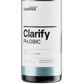 Clarify Phobic CarPro (500ml) - Limpa Vidros Hidrofóbico não só remove a sujeira e as manchas, mas também deixa uma camada altamente hidrofóbica que melhora a visibilidade do motorista em condições climáticas adversas e reduz a vibração do limpador.