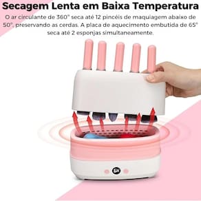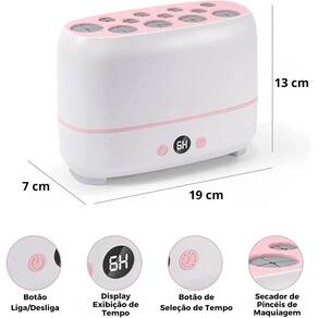Capacidade para 12 Pincéis e 2 Esponjas: Esta máquina multifuncional pode secar simultaneamente até 12 pincéis e 2 esponjas, otimizando o tempo e espaço no seu espaço de beleza. Ideal também para secar barbeadores e joias. Secagem a Temperatura Constante sem Danificar Cerdas: A MakeUpPro mantém uma temperatura de 65°C na base e 45-50°C internamente, garantindo que suas esponjas e pincéis de maquiagem sejam secos lentamente sem danificar as cerdas, independentemente do material. Aquecimento Lento para Preservar a Qualidade: A MakeUpPro seca seus pincéis de maquiagem a baixas temperaturas (45-50°C), preservando a integridade das fibras sintéticas ou naturais. Ideal para uso diário sem comprometer a qualidade das ferramentas. Operação Simples e Intuitiva: Após a limpeza dos pincéis e esponjas, coloque-os na máquina e selecione o tempo desejado com facilidade. O botão esquerdo liga a máquina e o botão direito ajusta o tempo de secagem. Carregamento USB Tipo-C: A conveniência do carregamento USB Tipo-C permite que você utilize a máquina em qualquer lugar. Garanta que seu plugue de carregamento atinge 5V 2A para um funcionamento perfeito. Design Compacto e Elegante: Com um design simples e elegante, a MakeUpPro é compacta e não ocupa espaço na mesa. Seu tamanho pequeno a torna perfeita para qualquer ambiente, sem comprometer a decoração.
