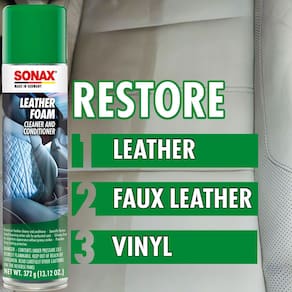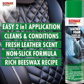 SONAX Espuma de couro 289300 | Limpador e condicionador de couro aerossol 2 em 1 | Seguro para uso em assentos perfurados com ar condicionado/aquecidos | Proteção UV evita danos UV | 369 g - Limpa e condiciona o couro: a espuma de couro Sonax é uma fórmula 2 em 1 premium com pH equilibrado que limpa e condiciona profundamente, removendo efetivamente manchas difíceis enquanto preserva e protege as superfícies de couro do seu carro. - Limpa e protege suavemente: a ação avançada de espuma levanta efetivamente a sujeira e a sujeira de todos os tipos de assentos de couro, incluindo superfícies aquecidas e perfuradas, garantindo uma limpeza segura e completa sempre. - Restaura o couro à condição de novo: limpa profundamente e rejuvenesce as superfícies de couro, restaurando sua maciez, maleabilidade e beleza natural autênticos, proporcionando proteção e cuidado duradouros. - Fórmula enriquecida com cera de abelha: a cera de abelha natural mantém o couro macio, flexível e hidratado, enquanto a fórmula sem silicone e não oleosa protege e melhora a aparência do seu couro sem deixar nenhum resíduo escorregadio.