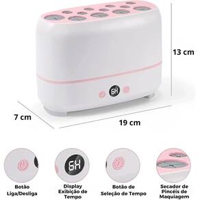 Capacidade para 12 Pincéis e 2 Esponjas: Esta máquina multifuncional pode secar simultaneamente até 12 pincéis e 2 esponjas, otimizando o tempo e espaço no seu espaço de beleza. Ideal também para secar barbeadores e joias. Secagem a Temperatura Constante sem Danificar Cerdas: A MakeUpPro mantém uma temperatura de 65C na base e 45-50C internamente, garantindo que suas esponjas e pincéis de maquiagem sejam secos lentamente sem danificar as cerdas, independentemente do material. Aquecimento Lento para Preservar a Qualidade: A MakeUpPro seca seus pincéis de maquiagem a baixas temperaturas 45-50C , preservando a integridade das fibras sintéticas ou naturais. Ideal para uso diário sem comprometer a qualidade das ferramentas. Operação Simples e Intuitiva: Após a limpeza dos pincéis e esponjas, coloque-os na máquina e selecione o tempo desejado com facilidade. O botão esquerdo liga a máquina e o botão direito ajusta o tempo de secagem. Carregamento USB Tipo-C: A conveniência do carregamento USB Tipo-C permite que você utilize a máquina em qualquer lugar. Garanta que seu plugue de carregamento atinge 5V 2A para um funcionamento perfeito. Design Compacto e Elegante: Com um design simples e elegante, a MakeUpPro é compacta e não ocupa espaço na mesa. Seu tamanho pequeno a torna perfeita para qualquer ambiente, sem comprometer a decoração.