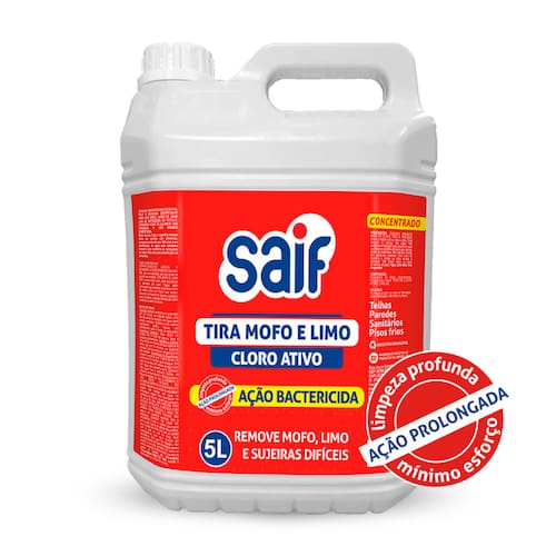 O Tira Mofo e Limo Com Cloro Ativo Saif remove mofo e limo, além de sujeiras e manchas em geral. Possui ação prolongada que deixa as superfícies livres do mofo e limo por muito mais tempo. Indicado na limpeza de rejuntes, azulejos, pisos, paredes, calçadas, telhados de telha cerâmica, brasilit, concreto, piscinas e muros. Atenção: Não deve ser aplicado puro em cima de superfícies pintadas.