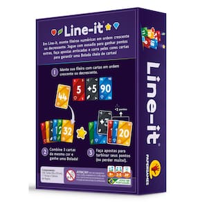 Em Line-it suas decisões valem ouro! Crie fileiras numéricas crescentes ou decrescentes, escolhendo entre garantir pontos imediatamente ou arriscar tudo para conquistar uma grande bolada! A cada rodada, tensão e diversão se encontram enquanto você equilibra risco e recompensa. Em Line-it, cada carta importa. Forme sequências com estratégia, use suas cartas de aposta para aumentar seus pontos e fique atento ao mercado. Observe o jogo dos adversários e aproveite o momento certo para pegar uma bolada, aumentando ainda mais sua pontuação. Fácil de aprender e dinâmico, Line-it é ideal para jogadores de todas as idades e níveis de experiência. Seja entre amigos ou em família, cada partida garante novas estratégias e reviravoltas surpreendentes. Você vai arriscar mais por uma grande recompensa ou garantir pontos seguros para vencer? 2-5 Jogadores | 20 min. | Idade: 8+ Conteúdo – 106 Cartas (56 x 87 mm)– 11 Fichas– Folheto de Regras