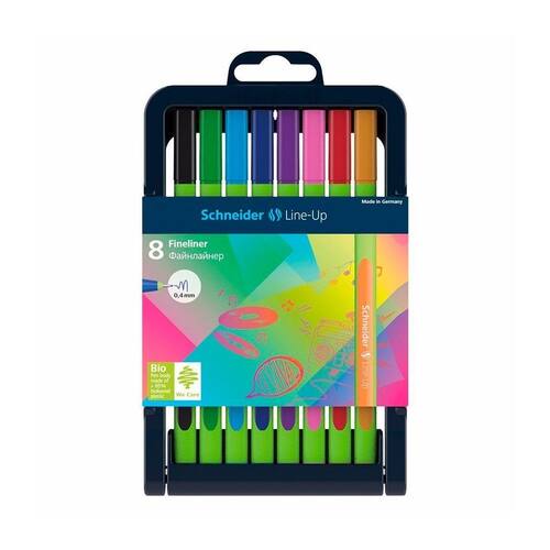 Line-up 0.4 Mm - Estojo 8 Cores Com Schneider Line-up, não são apenas cadernos e livros que ficam belos e coloridos, a natureza também As canetas Line-up são produzidas usando plástico biológico, matéria-prima sustentável, para proteger o meio ambiente. Com sua ponta ultra-fina de 0.4mm é a companheira perfeita para combinar desenhos e escrita. Sua tinta com tecnologia cap-off não resseca, mesmo que a caneta fique destampada por 2 ou 3 dias exceto cores neon . A escrita é super confortável graças ao corpo triangular ergonômico, com pega emborrachada. As fineliners Line-Up possuem, ainda, o certificado internacional Blauer Engel cedido a produtos ecologicamente corretos.