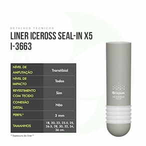 Método de Suspensão: Seal-In X5. Com uma série de cinco selos, o liner Iceross Seal-In X5 se adapta à forma do membro residual e à parede interna do encaixe, proporcionando uma vedação hermética e maior conforto.