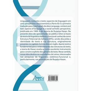 Linguagem, contexto e texto: aspectos da linguagem em ums perspetiva sócio-semiótica (Parte B) é a primeira tradução para o português da obra Language, context and text: aspects of language in a social-semiotic perspective, publicada em 1989, e de autoria de Ruqaiya Hasan. Na presente obra são apresentadas ao público leitor as bases da teoria da linguística sistêmico-funcional conhecida como Estrutura Potencial do Gênero (EPG), sendo discutida a identidade do texto e sua estrutura, originalmente presentes no capítulo 4 e 6 da obra em inglês. Aporte teórico fundamental para o entendimento das estruturas do texto, a teoria de Hasan revela-se como excelente instrumento para o ensino explícito dos gêneros de texto. Nesse sentido, nossa obra destina-se a estudantes de Letras, interessados nas pesquisas da linguística sistêmico-funcional e, particularmente, nas postulações de Ruqaiya Hasan.