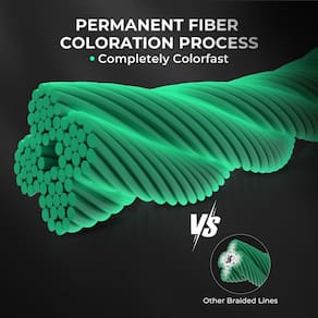 A linha de pesca trançada KastKing SuperPower Colorshield4X é fabricada usando uma solução patenteada de fibra UHMWPE tingida. A coloração é injetada na resina de fibra antes do processo de centrifugação para uma linha completamente resistente à cor. Este processo não permite perda de cor durante carretel, pesca ou uso prolongado. A coloração permanecerá na linha e não irá sangrar ou transferir.