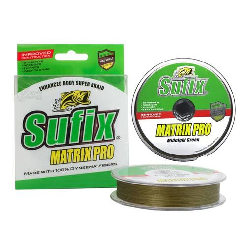 Especificações: - Marca: Sufix - Modelo: Matrix Pro - Tipo: Linha multifilamento - Quantidade de fios: 4 fios - Material: Fibras 100% HMPE - Comprimento: 250 m (275 yds) - Diâmetro: 0,40 mm - Resistência: 100 lb (45,0 kg) - Cor: Verde - Alongamento: Próximo de zero - Sensibilidade: Alta - Resistência à abrasão: Elevada - Arremesso: Suave e preciso - Tecnologia: Matrix Braid + PE WaxShield