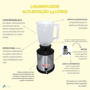 O liquidificador profissional de alta rotação é indicado para ser utilizado em restaurantes, bares, lanchonetes, padarias, buffets, cozinhas industriais e muitos outros lugares que necessitem de um liquidificador de alto desempenho. Sua base é confeccionada em polipropileno e seu copo com capacidade para 1,5 litros é feito em plástico altamente resistente, proporcionando alta resistência ao liquidificador industrial.