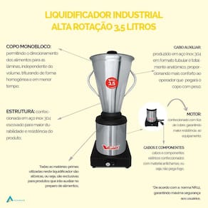 O liquidificador profissional de alta rotação é indicado para ser utilizado em restaurantes, bares, lanchonetes, padarias, buffets, cozinhas industriais e muitos lugares que necessitem de um liquidificador de alto desempenho. Sua base é confeccionada em polipropileno e seu copo com capacidade para 3,5 litros é feito em aço inox, proporcionando alta resistência ao liquidificador industrial.