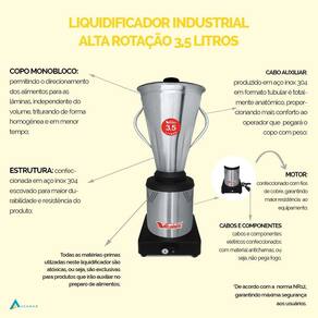 O liquidificador profissional de alta rotação é indicado para ser utilizado em restaurantes, bares, lanchonetes, padarias, buffets, cozinhas industriais e muitos lugares que necessitem de um liquidificador de alto desempenho. Sua base é confeccionada em polipropileno e seu copo com capacidade para 3,5 litros é feito em aço inox, proporcionando alta resistência ao liquidificador industrial.