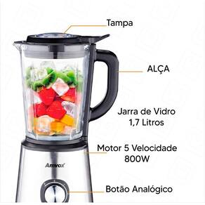 Especificações técnicas: - Marca: Amvox - Modelo: Alq 0209 - GTIN/ EAN: 7898649372045 - Potência: 800W - Voltagem: 127V - Jarra liquidificador: 1,7 litros - Cor: Preto, detalhe em aço inox - Acabamento: Plástico - Lâminas: Sim - Com jarra: Sim - Material jarra: Vidro - Tamanho: Portátil - Dimensões L x A x C : 19,5 x 25,30 x 34,50 cm - Peso: 3,76kg - Peso bruto: 4,3kg