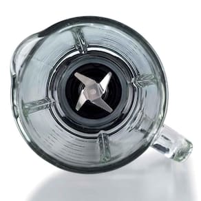 Copo de vidro graduado tanto em ml (até 1,5 L de capacidade) como em copos, tampa com vedação dupla e tampa removível para adicionar ingredientes