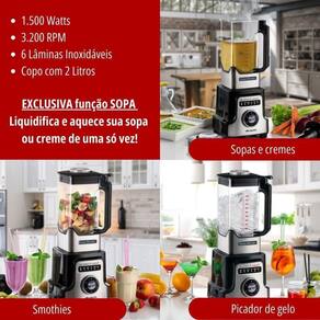 Fundada em 1964, a italiana Ariete faz parte do grupo De'Longhi que é reconhecido pela qualidade e inovação de seus produtos. Através dos anos e com muita criatividade, a marca desenvolve produtos inteligentes, com uma beleza característica, que proporcionam praticidade, diversão e dão um toque de cor e vida para o seu dia a dia, para os encontros com os amigos e a família.Bata, misture e aqueça: muitas funções em um único liquidificador. Descubra tudo o que você pode fazerO Ariete Blend & Heat é um poderoso liquidificador profissional multifuncional para preparar shakes, smoothies, sucos, milkshakes, molhos, condimentos, mas também sopas quentes e aveludadas prontas para serem saboreadas em poucos minutos graças à função Sopa que permite misture e aqueça os ingredientes ao mesmo tempo.O corpo em conjunto com as 6 lâminas de aço inoxidável garantem a máxima resistência e robustez, enquanto a potência de 1500 Watts com 32000 rpm permite misturar frutas, legumes e muitos outros ingredientes, incluindo gelo para seus coquetéis, de forma rápida e prática, mantendo as propriedades nutricionais da comida inalterada. É por isso que o Blend & Heat é perfeito para todos aqueles que seguem dietas com alta absorção de nutrientes e gostam de preparar shakes proteicos ou energizantes para serem consumidos após atividades esportivas intensas.Muito útil também para preparar papinhas e alimentos para bebês, sem perder as características naturais das frutas e legumes, ou lanches saudáveis e integrais a qualquer hora do dia. A função de aquecimento permite misturar e aquecer ao mesmo tempo, para preparar sopas aveludadas e saborosas, prontas a servir.Introduzir os ingredientes no copo de 2 litros é muito fácil graças ao prático orifício na tampa e ao acessório para espremer alimentos fornecido. O Blend & Heat está equipado com o sistema de dupla segurança EK1, com travamento automático das lâminas em caso de necessidade, para uma utilização segura do produto.Teste o Blend & Heat com smoothies e milkshakes, sopas e purês, molhos e coquetéis.Especificações:modelo: 0578Cor: Prata e preto Potência: 1500 WattVoltagem: 220VVelocidades: 10LED do visor: SimLâminas: 6 em aço inoxidávelRotação: 32000 RPM Copo: 2L máx. 3l alça de borracha de toque macio: SimCopo graduado: SimAbertura na tampa com fechamento: SimBase do copo e detalhes do corpo: Aço inoxProgramas automáticos: 6Função Sopa: SimFunção de triturador de gelo: SimTemporizador: 10 minutosFunção de pulsar: SimPés antiderrapantes: SimEspremedor de Alimentos: SimDupla segurança EK1 na base e tampa: SimDimensões C x A x L : 20,00 x 49,00 x 22,00 cmPeso do produto: 4,95 kgPeso da caixa: 5,87 kgSKU: 00C057800ARBREAN: 8003705118942