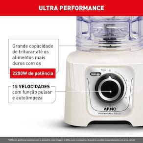O Liquidificador Arno Power Max 2200W foi desenvolvido para facilitar o preparo de diferentes receitas no dia a dia. Possui 15 velocidades e função Pulsar, permitindo ajustar a intensidade conforme cada preparo.
