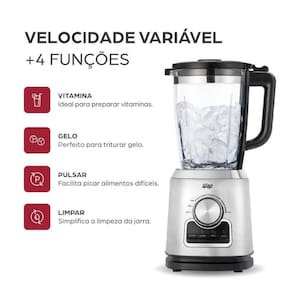 Além da velocidade variável, aproveite os quatro modos de trabalho pré-programadas do aparelho. São elas a Função Vitaminas, Função Pulsar, a Função Gelo e a Função Limpar.