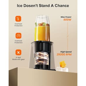 O liquidificador pessoal, alimentado por um motor de 900 W, é ideal para misturar shakes, vitaminas, alimentos para bebês, sorvetes, bebidas proteicas, nozes, especiarias, grãos de café e café fresco.