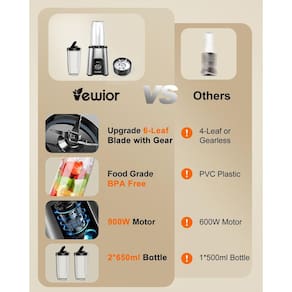 - Liquidificadores multifuncionais para cozinha: com um motor potente de 900 W, um pequeno liquidificador para batidos e vitaminas para VEWIOR mistura rápida. A lâmina de 6 folhas pode ser usada para vitaminas, sucos, shakes, alimentos para bebês, sorvetes e bebidas proteicas.