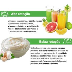 Baixa Rotação: Indicada para o processamento de ingredientes mais densos, nos quais é necessária mais força e menos velocidade, tais como massas de bolo, maionese, açaí, feijão, sopas, molhos, cremes, entre outros