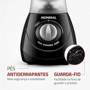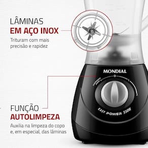 Liquidificador L550 550w Preto Mondial Preto 110v O liquidificador Mondial Easy Power 550W e um aliado na rotina na cozinha. Sao 550W de potencia, capacidade total de 1,9 litros, alem de 2 velocidades + Funcao Pulsar, que tritura ate ingredientes mais duros. Voce pode preparar torta de frango, bolo de milho, pao de queijo, massa de panqueca, queijadinha e muitas outras receitas com praticidade e rapidez. Caracteristicas: Liquidificador Marca: Mondial Modelo: L550 Material de Fabricacao: Polipropileno Material das Laminas: Inox Capacidade: 1 Litro Consumo: 0,55Kw/h Potencia: 550W Velocidade: 02 velocidades Funcoes do Produto: Pulsar, Triturar, Bater