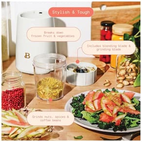Liquidificador pessoal compacto de 240W da linha Beautiful by Drew Barrymore, com acabamento branco fosco e sistema de copos para preparo direto e consumo imediato de bebidas e receitas em pequenas porções. Utiliza conjunto de lâminas em aço inox para mistura e trituração, indicado para smoothies individuais, pequenos molhos, preparo de alimentos em porções reduzidas e moagem de café e temperos secos. ? O kit inclui base com motor, copos de diferentes capacidades, tampa de viagem com alça e canudo com sistema anti-pingos, além de tampas para armazenamento e anéis de acabamento para beber diretamente no copo. Os recipientes são produzidos em material livre de BPA, compatíveis com lava-louças na prateleira superior, enquanto a base é acionada por giro, facilitando o uso em bancadas compactas.