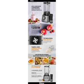 Ideal para preparar diversos tipos de alimentos! O Liquidificador Philco 12 + Turbo 3L 1200W prepara vitaminas, molhos, sopas cremosas e muito mais. Suas lâminas ultra afiadas, trituram e misturam com grande eficiência, desde alimentos a gelo. São 12 diferentes velocidades para você encontrar a que mais se adapta ao seu preparo. Além da Função Pulsar, que ajuda a controlar o nível de trituração do preparo e auxiliar na Limpeza, com Função Auto Limpeza, para não precisar esfregarcopo.