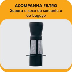 Ele tem copo de vidro resistente a riscos e a manchas, faca com 4 lâminas em aço inoxidável, sendo duas serrilhadas com altíssima capacidade de corte, tampa com sobre tampa e orifício para colocar ingredientes e com proteção de silicone, que evita vazamentos.