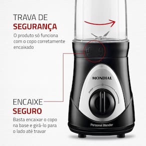 Leve suas bebidas para onde quiser! Com o Personal Blender da Mondial, acompanha 2 copos de 750mL cada, assim você prepara sucos, vitaminas, shakes e coquetéis e pode carregar para academia, escritório ou qualquer outro lugar. Os 300W de potência, lâminas em aço inox e 2 velocidades + pulsar, proporcionam um excelente desempenho no preparo das bebidas. Aproveite a qualidade que a Mondial oferece!